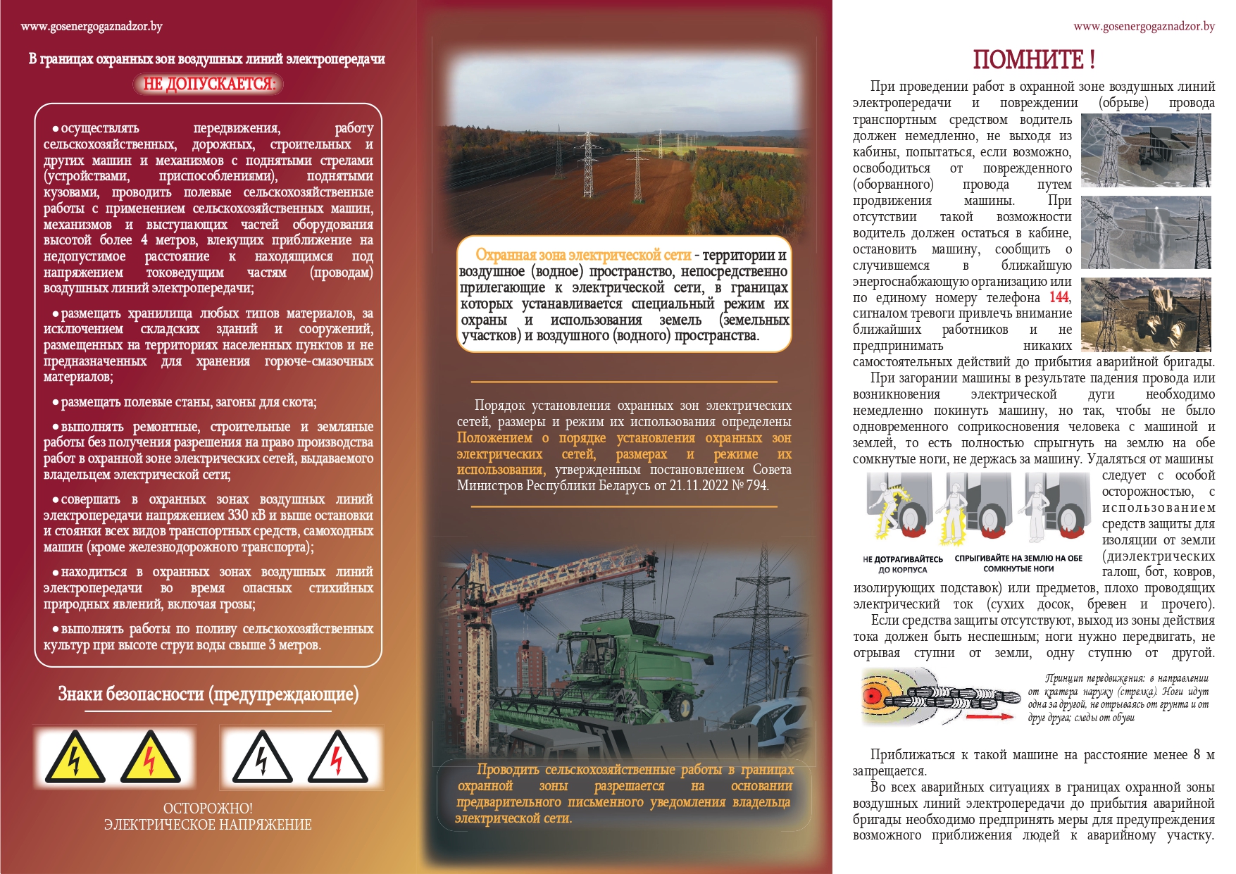 Государственным учреждением «Государственный энергетический и газовый надзор» разработаны: электронный альбом с визуализацией типовых нарушений при эксплуатации электроустановок и газоиспользующего оборудования гражданами, памятка по электробезопасности для населения, памятка по электробезопасности в быту, памятка по электробезопасности при проведении работ в охранных зонах воздушных линий электропередачи, памятка по электробезопасности при осуществлении рыбной ловли.