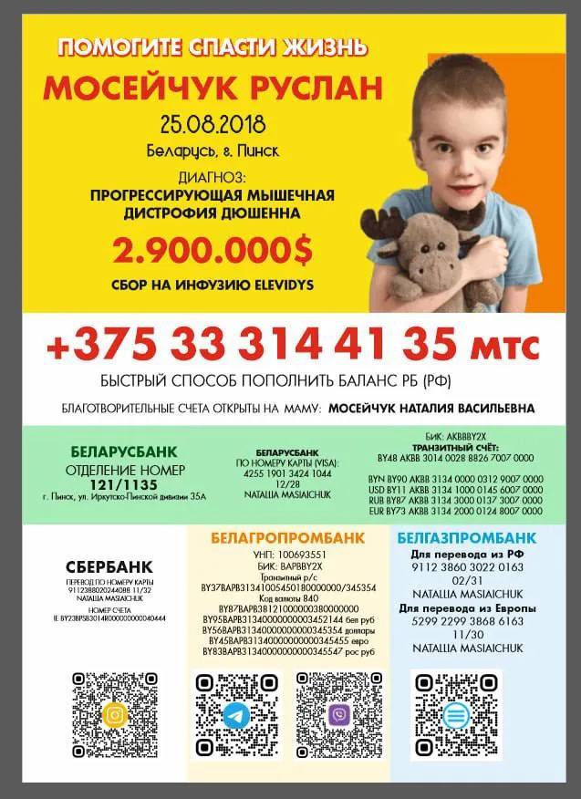 12 сентября 2025 года Руслану Мосейчуку в РНПЦ «Мать и дитя» диагностировали прогрессирующую мышечную дистрофию Дюшенна. Это тяжёлое наследственное заболевание, вызванное мутацией гена DMD, который кодирует белок дистрофин. Без него мышцы постепенно разрушаются, и ребёнок теряет способность двигаться, дышать, жить.
