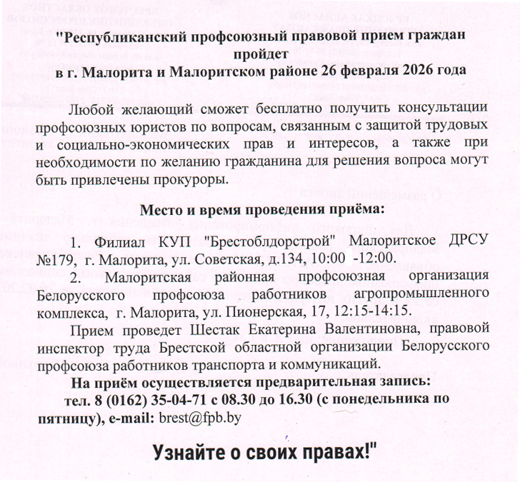 Республиканский профсоюзный правовой прием граждан пройдет в г. Малорита и Малоритском районе 26 февраля 2026 г.