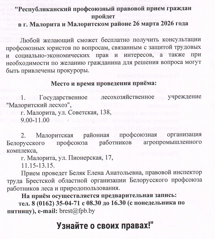 Республиканский профсоюзный правовой прием граждан пройдет в г.Малорита и Малоритском районе 26 марта 2026 года.