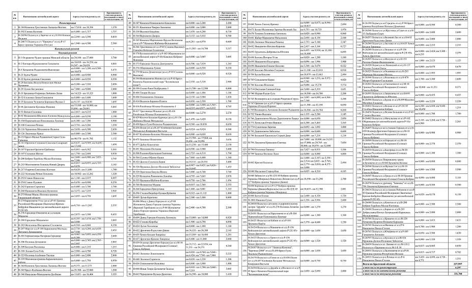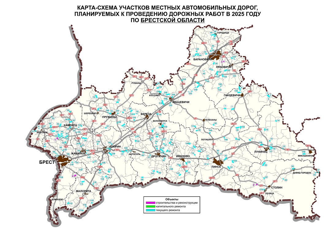 Карта-схема участков местных автомобильных дорог, планируемых к проведению дорожных работ в 2025 году по Брестской области