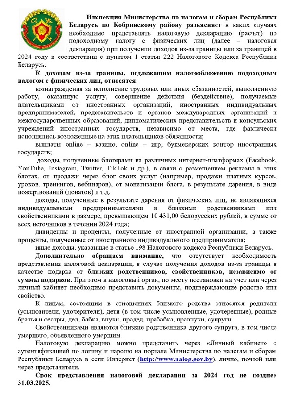 Инспекция Министерства по налогам и сборам Республики Беларусь по Кобринскому району информирует о необходимости представления налоговой декларации (расчета) по подоходному налогу с физических лиц, в связи сполучением в 2024 году доходов за границей или из-за границы