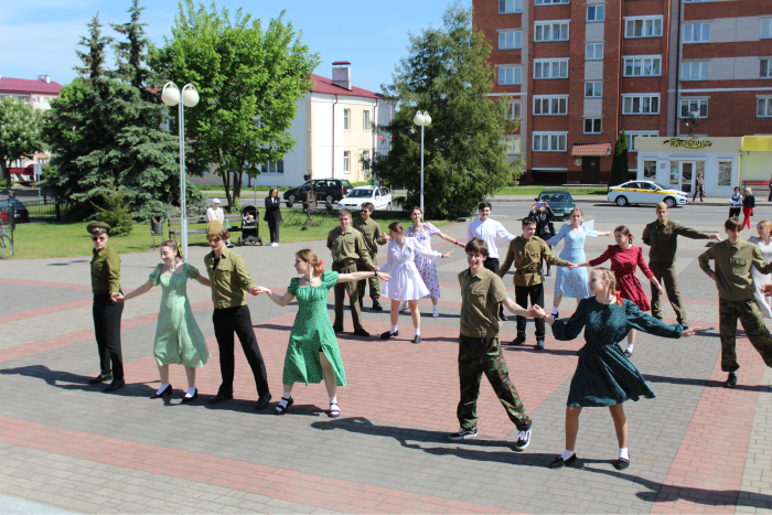 На пляцоўцы перад ГДК вучні 9 і 11 класа СШ № 1 прадставілі харэаграфічную кампазіцыю “Майскі вальс”. Рэжысёрам-пастаноўшчыкам яе стала настаўніца факультатыўнага занятку “Рытміка і танцы” ўстановы адукацыі Аляксандра Вашчынчук. Прыгожы танец некалькіх пар, у якіх юнакі былі апрануты ў ваенную форму, а дзяўчаты – у сукенкі, быў сустрэты апладысментамі прысутных на пляцоўцы перад ГДК.
