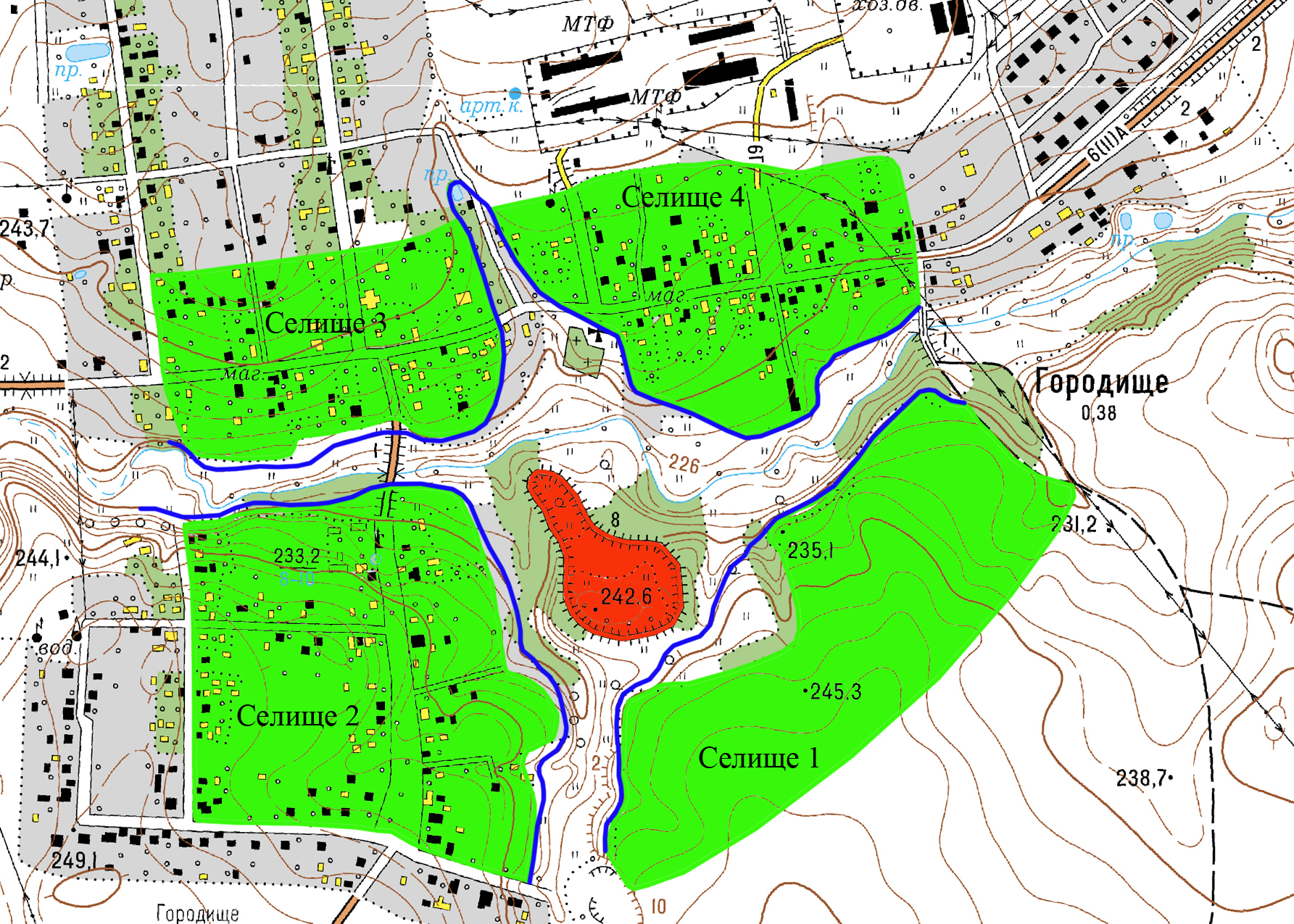 Чатыры селішчы знаходзяцца вакол гарадзішча. Селішча 1